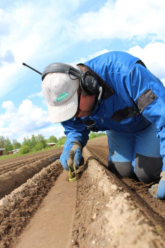 -Kaksi ja puoli senttiä. Tämä on nyt hyvässä syvyydessä. Koko kylvökerroksessa on sopiva kosteus, jotta porkkana lähtee hyvin itämään, toteaa luomuviljelijä Paavo Pulkkinen rullamitta kädessään.
