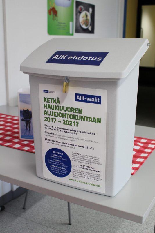 Kaikilla haukivuorelaisilla oli mahdollisuus tehdä jäsenehdotuksia Haukivuoren aluejohtokuntaan kaudelle 2017–2020. Jäsenehdokkaiden nimiä kerättiin kirjastossa, Wanha Osulassa, S-marketissa ja Supalla. Määräaikaan mennessä toimipaikkoihin jätettiin liki 50 listaa, jonka lisäksi sähköpostiin oli jätetty 30 esitystä. Äänestämässä kävi 78 henkilöä ja kaikkiaan henkilöehdotuksia annettiin 272.