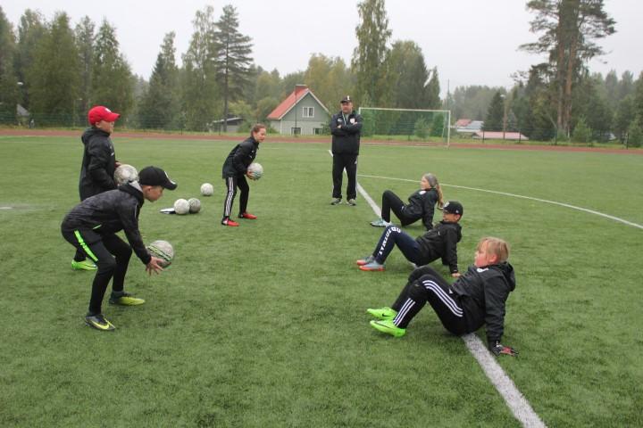 Kiitolan kentällä potkittiin viime torstaina jalkapalloa. Pallon perässä juoksi vajaat kymmenen lasta, jotka tekivät ohessa erilaisia pallonkäsittelyharjoituksia Juha Nikulaisen ohjauksessa. Mukana oli E10-junnuja ja yksi F8-sarjan pelaaja, joka oli tullut kentälle jo etuajassa ennen omia harjoituksia.
