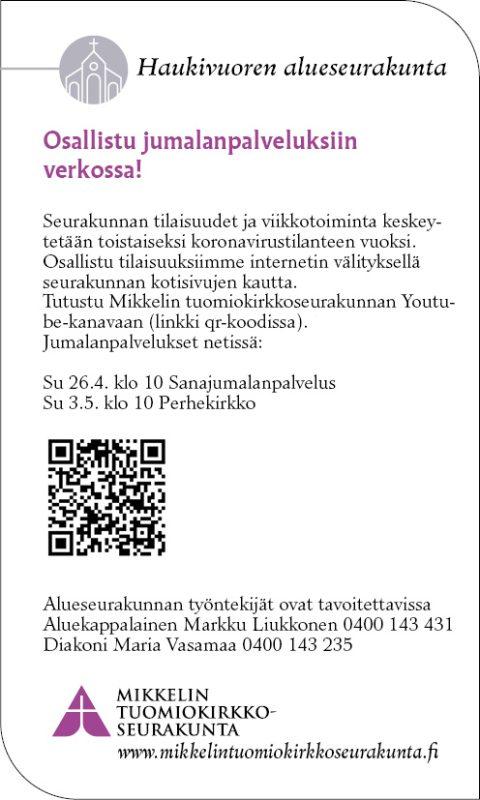 Kirkolliset 22.4.2020 22.4.2020 Yleinen Tänään ilmestyneestä HaSesta jäi puuttumaan kirkolliset, mutta tässä tiedoksi.