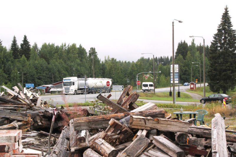 Kyläläisiä on harmittanut, että hirsien viennin jälkeen tontille on jäänyt iso kasa pienempää puutavaraa ja muuta purkujätettä. Näkyvällä paikalla oleva kasa tervehtii ensimmäisenä Haukivuorelle tulevia.