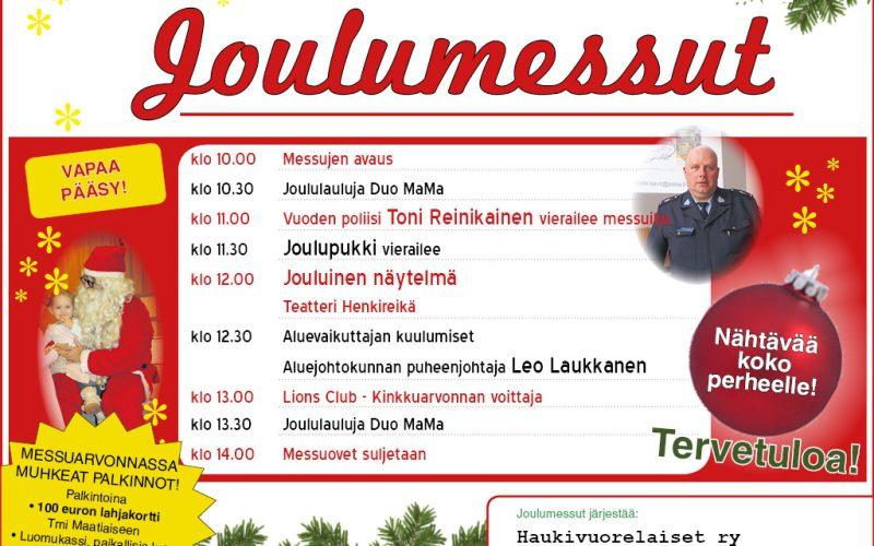 Viime viikon lauantaina vietettiin perinteisiä Joulumessuja Hauki-Hallilla. Tällä kertaa päävastuussa tapahtumasta olivat Haukivuorelaiset ry. – Täytyy olla todella tyytyväinen, kaikki on sujunut meidän mielestämme moitteettomasti, aktiivisesti järjestelyissä mukana ollut Maarit Sorvali kertoi messuhulinassa. Niin […]